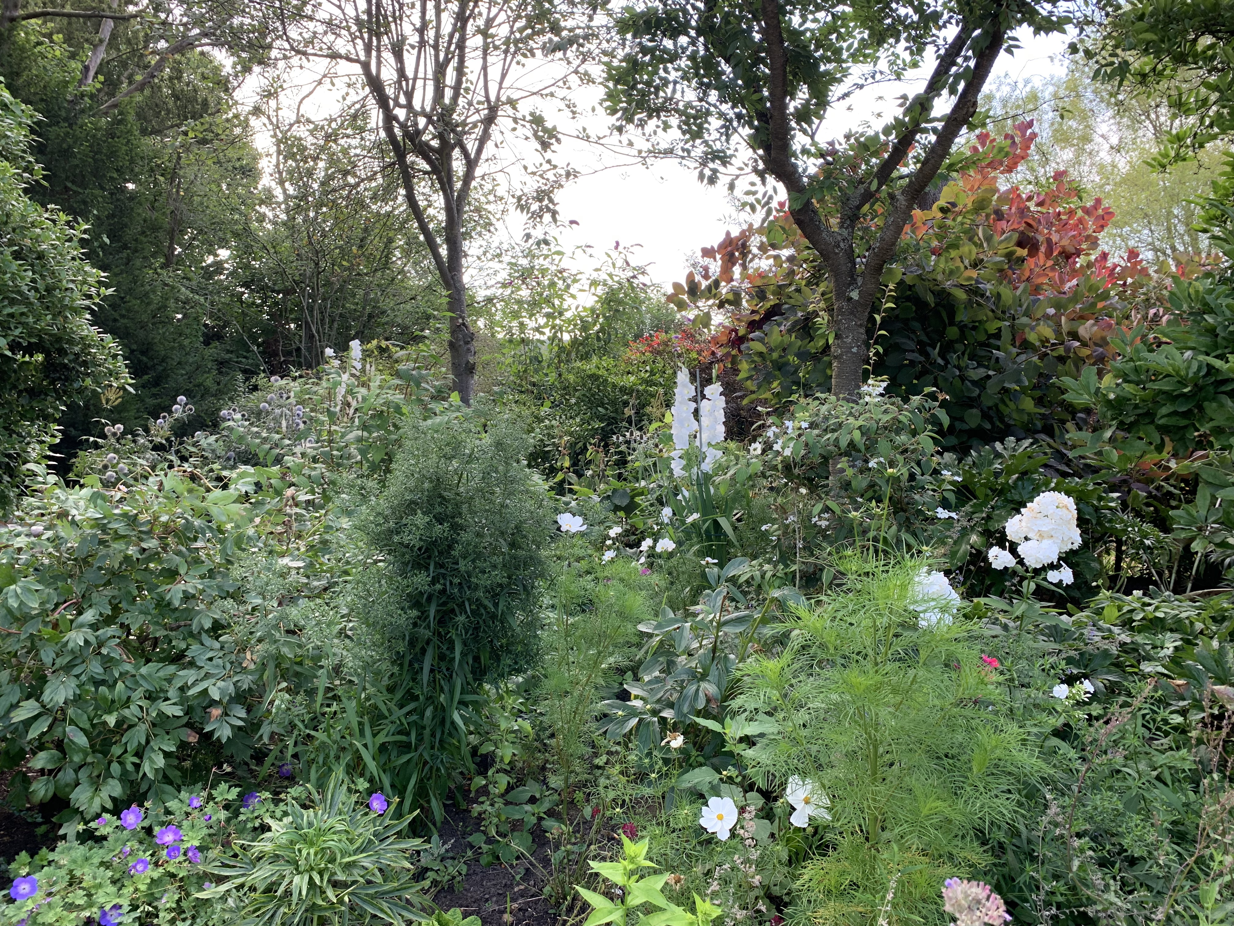 To the right of the house is a wide border planted with shrubs and flowers. It is lovely in spring with Magnolia stellata and Magnolia soulangeana and early scented flowering shrubs, underplanted with bulbs. In 2022 some of the trees growing at the back of the bed were removed letting much more light in and the flowers have all enjoyed it, especially the dalhias.