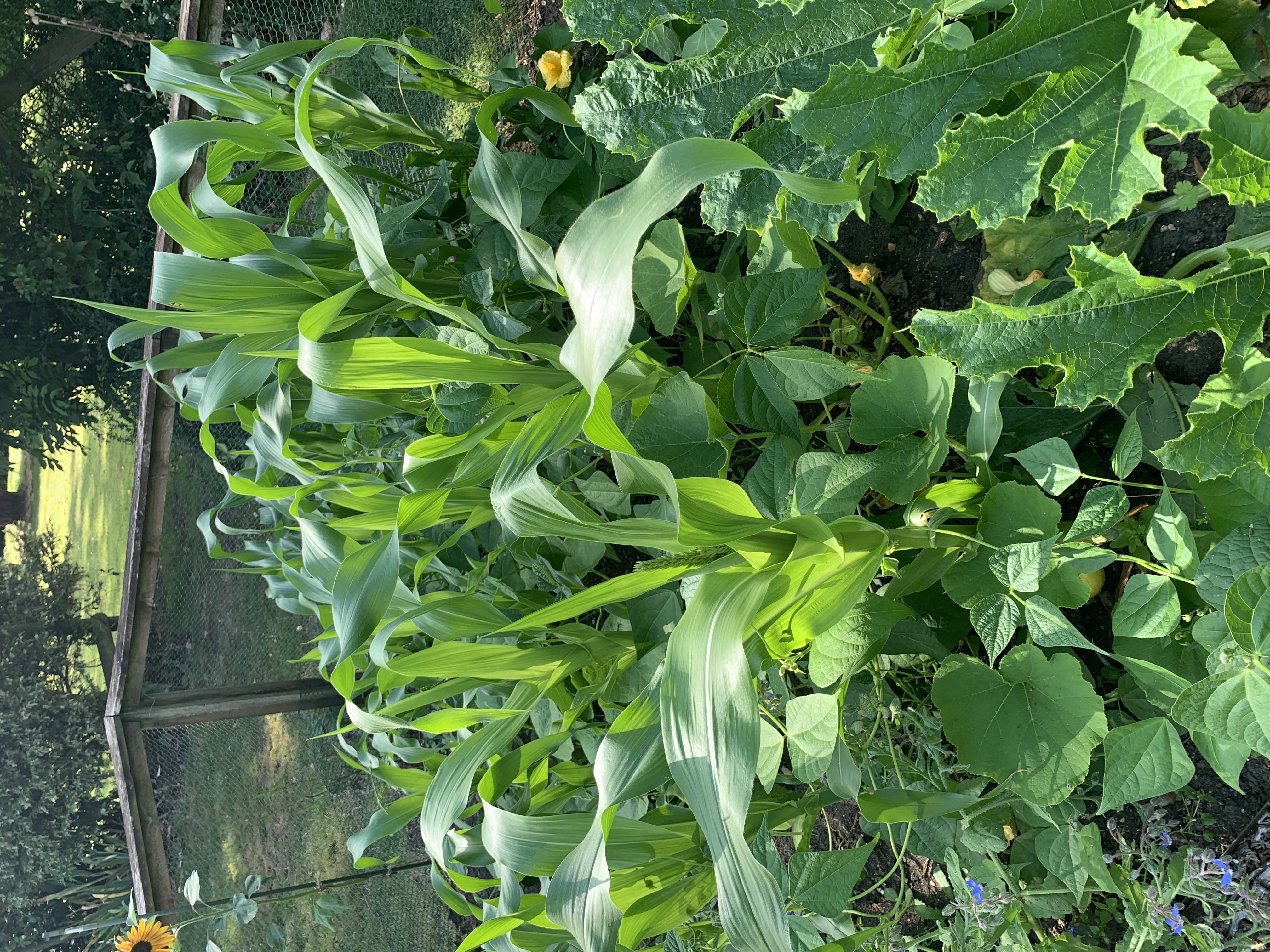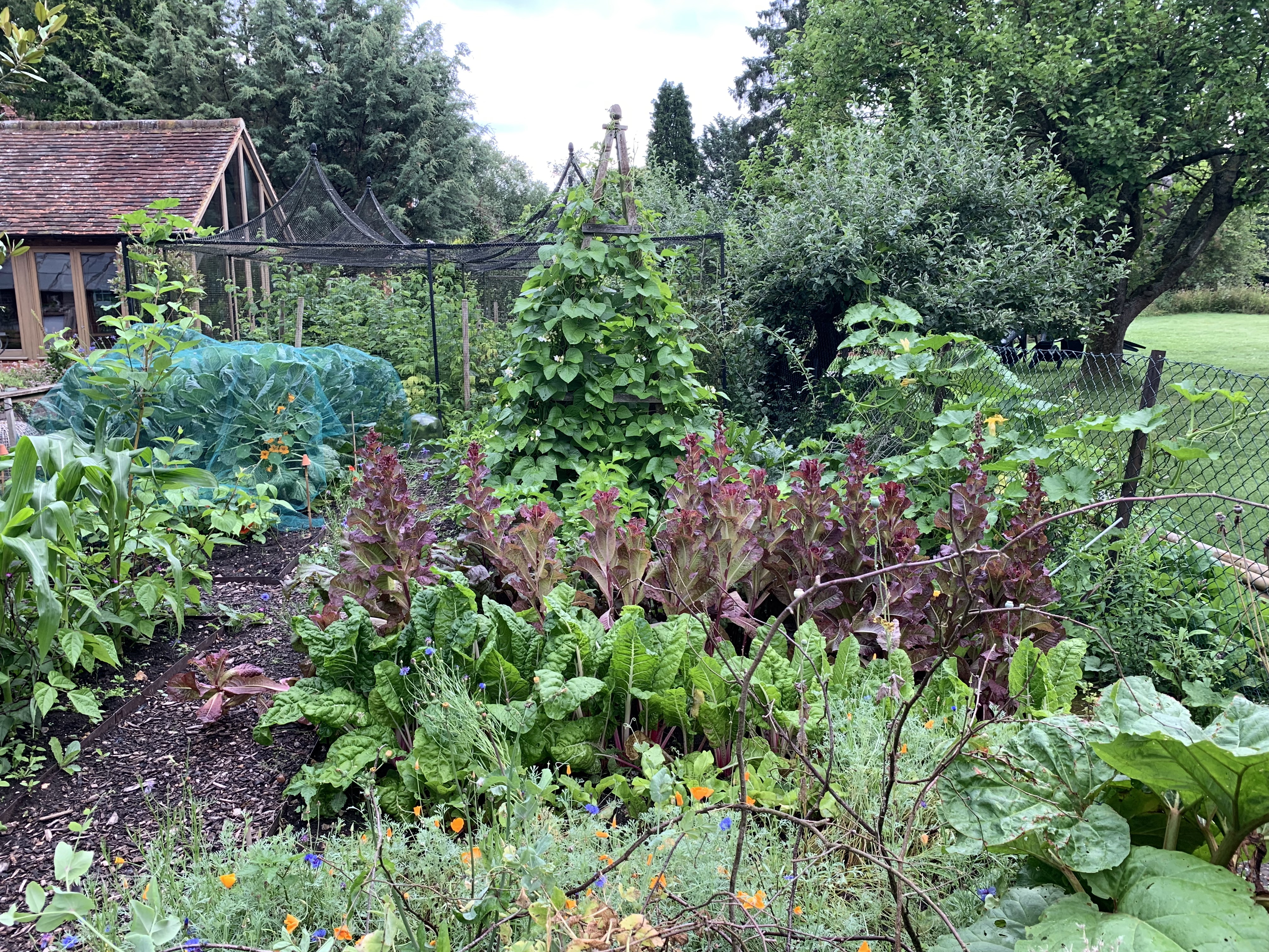 All vegetables in the veg patch are grown from seed and pleasure is taken in planting them out in attractive arrangements, sticking of course, to the principle of rotating each plot through brassicas, roots, alium and beans. It's usually possible to get 2 crops out of most of the veg beds, provided the broad beans can be harvested in time, to get in the sweet corn following